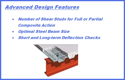 Both wide-flange and channel sections can be designed for full or partial composite action. Design considerations include shored /unshored construction, deflection checks, slab reinforcement at negative moments and more.
