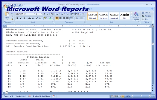 • Output includes required bar spacing for various bar sizes or, for the case of unreinforced walls, spacing of grouted cells.