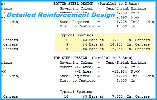 - Reinforcement design includes multiple bar size options and corresponding spacing. Minimum steel for temperature and shrink is determined and the user is warned if the footing becomes over-reinforced. When development is inadequate the program warns the user that anchorage must be provided.
