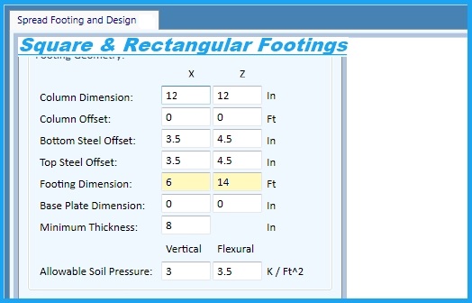 - Dimension restrictions can be entered to control the design of the footing when space limitations are present. User defined increment factors assure that the program does not design footings of impractical size–no 46.5″ x 27.33″ footings!